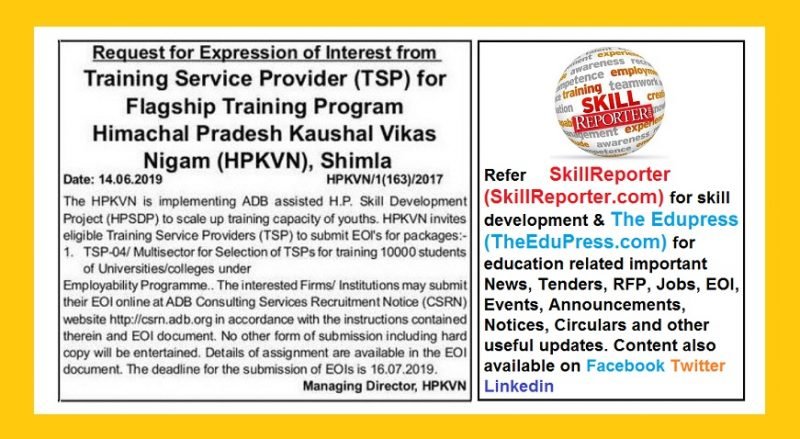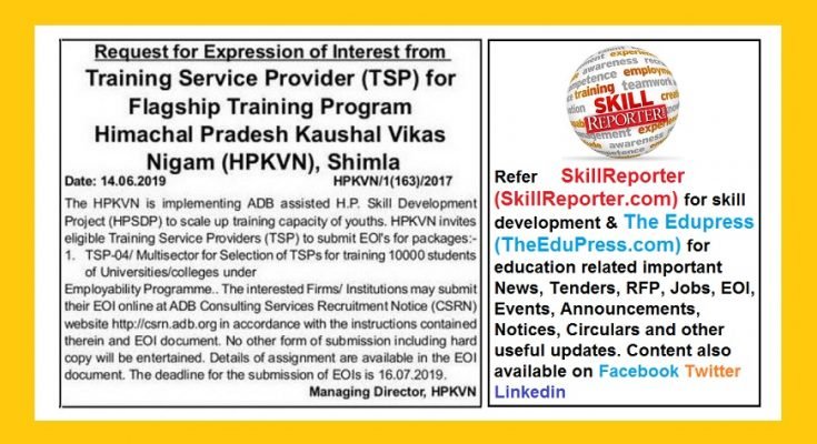 HPKVN invites eligible Training Service Providers (TSP) to submit EOIs for package “TSP-04/Multisector for Selection of TSPs for training 10000 students of Universities / colleges under Employability Programme”.