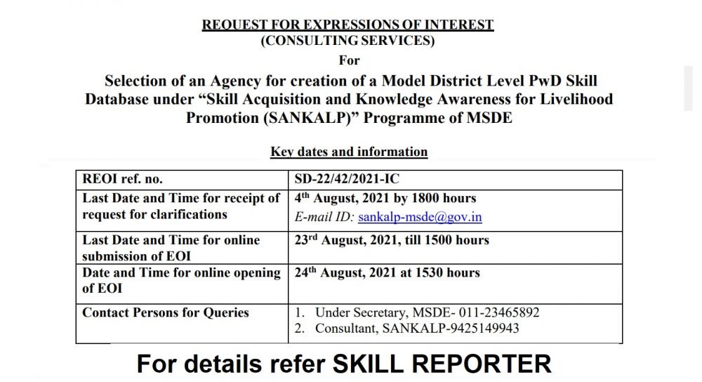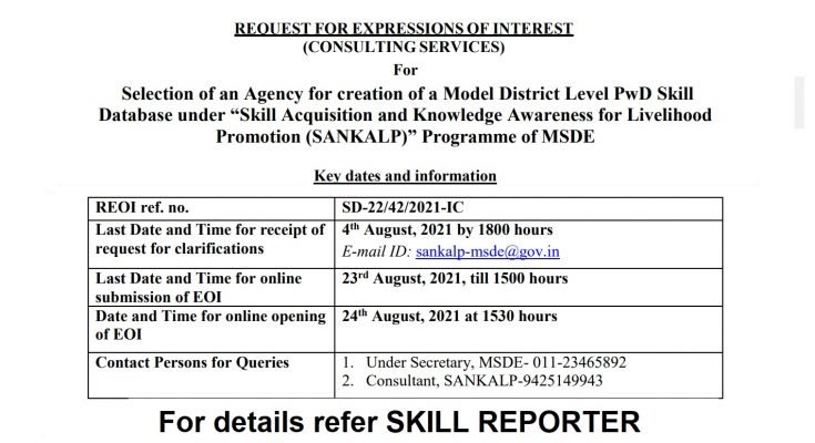 Ministry hereby through its REOI ref. no. SD-22/42/2021-IC advertises its Request for Expression of Interest (REOI) for selection of an agency for ‘Creation of a model district level PwD skill database’ under Skill Acquisition and Knowledge Awareness for Livelihood Promotion (SANKALP) Project of MSDE.