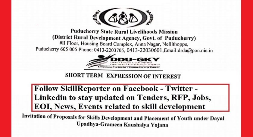 Puducherry State Rural Livelihood Mission (PSRLM) through its notification No. J-17080/01/DRDS/PSRLM/DDUGKY/2018-19 invites proposals under DDU-GKY from the Project Implementation Agencies (PIA) registered with Ministry of Rural Development, Government of India with valid PRN for implementation of Deen Dayal Upadhyaya-Grameen Kaushalya Yojana (DDU-GKY) for Skills Development and Placement of youth in the State of Puducherry (Puducherry and Karaikal). Interested agencies may submit their proposal(s) online at www.erp.ddugky.info White formulating the Proposal notifications issued by Ministry of Rural Development, Government of India from time to time regarding implementation of scheme should be taken into consideration prior to filling proposals online.
