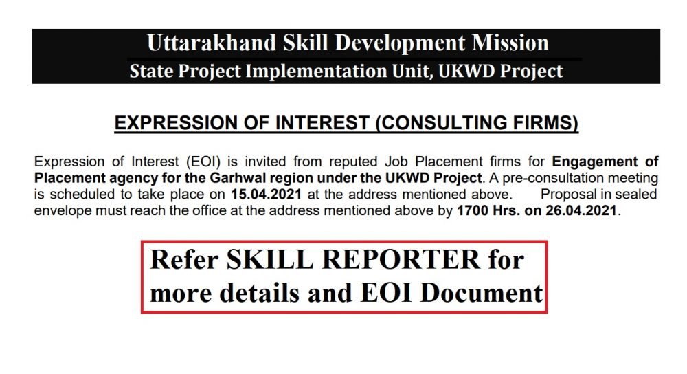 The Project Director, Uttarakhand Workforce Development Project (UKWDP) now invites eligible Firms/agencies to indicate their interest in providing the Services for Placement agency/firm for placement support to pass-out trainees of Govt. ITIs located in Garhwal Region(Uttarakhand).