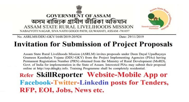 Assam State Rural Livelihoods Mission (ASRLM) through its notification No. ASRLMS/DDU-GKY/1648/2019-20/924 invites proposals under Deen Dayal Upadhayaya Grameen Kaushalya Yojana (DDU-GKY) from the Project Implementing Agencies (PIAs) having Permanent Registration Number (PRN) obtained from the Ministry of Rural Development (MoRD), Govt. of India for implementation in the State of Assam. Interested PIAs may submit their proposal online at http://erp.ddugky.info. Training Programme shall be completely residential. The PIA will have to pay an application fee of Rs. 25000.00 (Rupees Twenty Five Thousand only), through NEFT/RTGS to the bank A/C of National Institute of Rural Development and Panchayati Raj,Hyderabad (Project Appraisal Agency)-