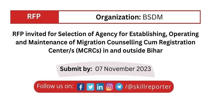 The primary objective of this RFP is the empanelment of an agency for the set-up/establishment, operation and maintenance of 10 MCRCs in major cities (industrial hub) outside Bihar and 10 MCRCs at identified districts of Bihar as per the norms and guidelines of BSDM till the end of the contract period. The services to be provided but not limited to by the MCRCs are divided into “Core Services” and “Value Added Services”. The indicative set of services are based on the key challenges faced by migrant workers and the experience of trained alumnus in various skill development programs under BSDM.