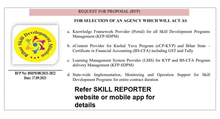 Additional Chief Secretary, Dept. of Labour Resources, Govt. of Bihar- cum- CEO, Bihar Skill Development Mission (BSDM), through this RFP No: BSDM/08/2021-2022 invites proposals (Two Bid System) from reputed and experienced organizations for selection of an agency which will act as: