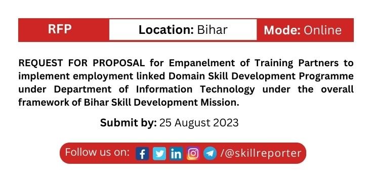 Principal Secretary, Dept. of Labour Resources, Govt. of Bihar- cum- CEO, Bihar Skill Development Mission (BSDM), invites proposals (Single Bid System) from reputed and experienced organizations to implement employment linked Domain Skill Development Programme under Information Technology Department, Govt. of Bihar under the overall framework of Bihar Skill Development Mission.