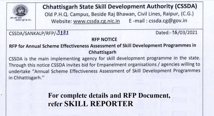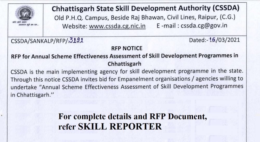 This RFP seeks the services of suitable organisations / agencies willing to undertake “Annual Scheme Effectiveness Assessment of Skill Development Programmes in Chhattisgarh” and preparation of Block wise, District wise, Sector and Course wise report for perspective plan for next five financial years, i.e.