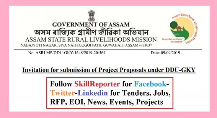 Assam State Rural Livelihoods Mission (ASRLM) through its notification number No. ASRLMS/DDU-GKY/1648/2019-20/564 Date: 09/09/2019 invites proposals under Deen Dayal Upadhayaya Grameen Kaushalya Yojana (DDU-GKY) from the Project Implementing Agencies (PIAs) having Permanent Registration Number (PRN) obtained from the Ministry of Rural Development (MoRD), Govt. of India for implementation in the State of Assam. Interested PIAs may submit their proposal online at http://erp.ddugky.info. Training Programme shall be completely residential. The PIA will have to pay an application fee of Rs. 25000.00 (Rupees Twenty Five Thousand only), through NEFT/RTGS to the bank A/C of National Institute of Rural Development and Panchayati Raj, Hyderabad (Project Appraisal Agency)-