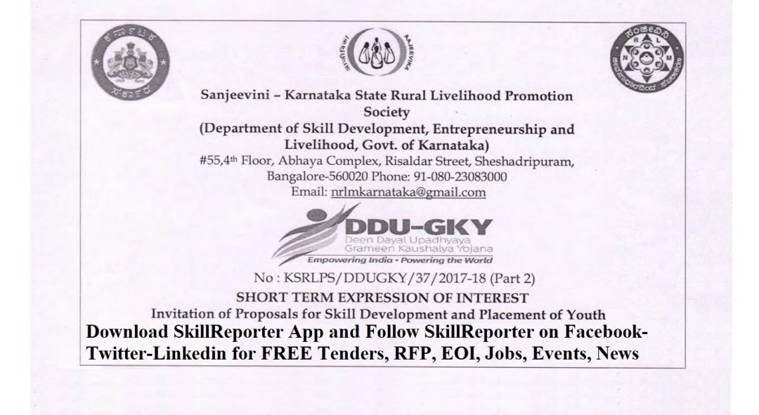 Karnataka State Rural Livelihood Mission (KSRLM) through its No.: KSRLPS/DDUGKY/37/2017-18 (Part 2) invites proposals under DDU-GKY from the Project Implementing Agencies (PIA) registered with Ministry of Rural Development, Government of India with valid PRN for implementation of Deen Dayal Upadhyaya- Grameen Kaushalya Yojana (DDU-GKY) for Skill Development and Placement of youth in the State of Karnataka. Interested agencies may submit their proposal(s) online at erp.ddugky.info. While formulating the proposal, notifications issued by Ministry of Rural Development, Government of India from time to time regarding implementation of scheme should be taken into consideration prior to filling proposals online. Last date and time for submitting proposal is 25 March 2020.