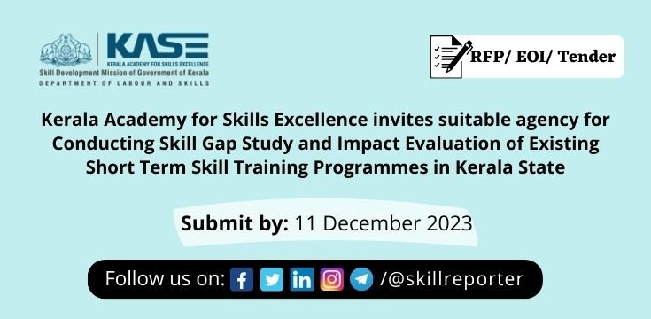 KASE, the State Skill Development Mission invites response to this Request for Proposal (RFP) document from the interested and eligible bidders for conducting ‘Skill Gap Study and Impact Evaluation of Existing Short Term Skill Training Programmes in Kerala State” in accordance with the conditions and manner prescribed in this RFP document through e-tender process at www.etenders.kerala.gov.in.