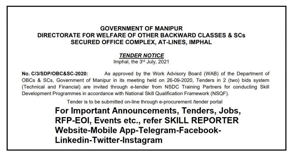 As approved by the Work Advisory Board (WAB) of the Department of OBCs & SCs, Government of Manipur in its meeting held on 26-09-2020, intended to publish Notification No. C/3/SDP/OBC&SC-2020: Tenders in 2 (two) bids system (Technical and Financial) are invited through e-tender from NSDC Training Partners for conducting Skill Development Programmes in accordance with National Skill Qualification Framework (NSQF).