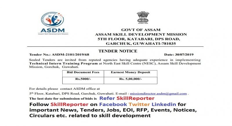 Assam Skill Development Mission (ASDM) through its RFP No ASDM-2101/2019/68 invites Sealed Tenders from reputed agencies having adequate experience in implementing Technical Intern Training Program at North East Skill Centre (NESC), Assam Skill Development Mission, Gorchuk, Guwahati.