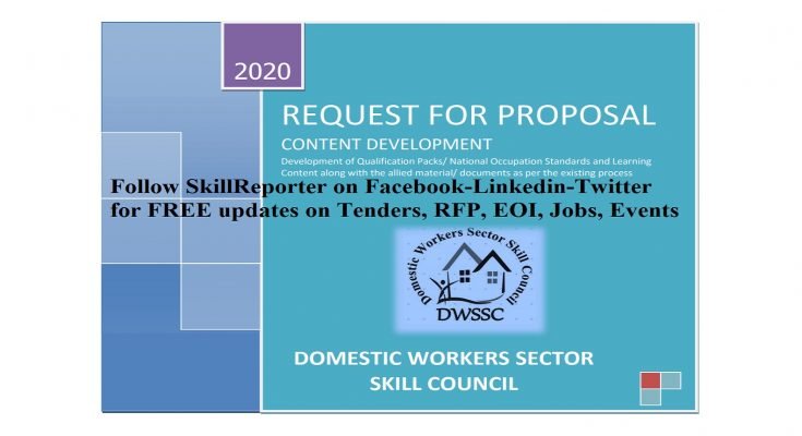 Domestic Workers Sector Skill Council (DWSSC) invites Organisations/ Consulting Firms for developing Learning content, National Occupational Standards and allied content/ documents/ material for Domestic Workers Sector, with a view to achieve the mission and objectives of the Sector Prospective Organisations/ Consulting Firms who meet the pre-qualification criteria may furnish their Request for Proposal (RFP) with all the necessary documents in through mail and send hard copy (in sealed cover) along with the covering letter duly signed by an authorized signatory on or before 30 Apr 2020 by 1730 hours to the following address: