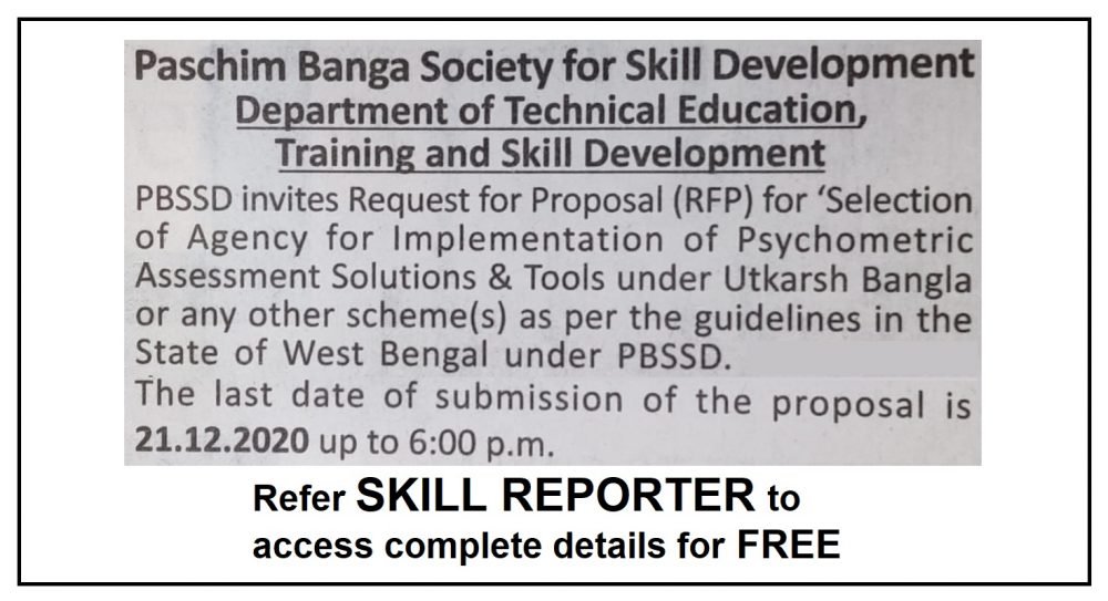 This document invites online proposals from reputed organization who are interested to provide solution and tools for conducting psychometric assessments to be utilized during the counselling process for shortlisting potential trainees. Based on evaluation of the proposal, Organization / Agency having the capability of providing solution for implementing solution and tools for conducting Psychometric Assessment will be shortlisted with PBSSD under all the short-term training under all the state, centre and jointly centre & state sponsored schemes. Complete details can be read in RFP Document (Click Here to view). The last date for receipt of the proposals is 21/12/2020 till 11:59:59 PM.