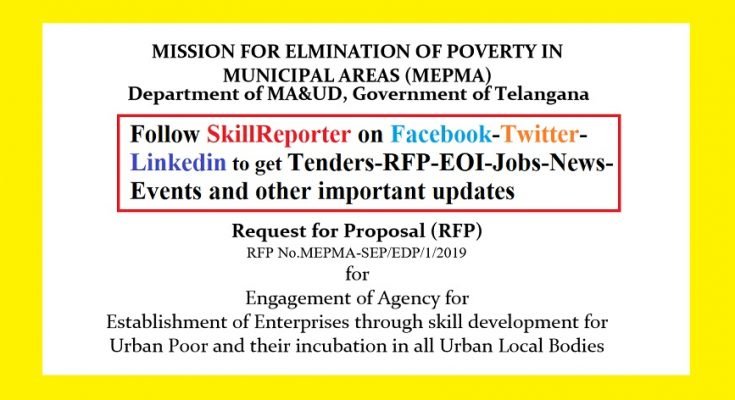 In pursuance of above, Mission for Elimination of Poverty Areas (MEPMA), intends to empanel a consultant with requisite experience and capabilities for Establishment of Enterprises through skill development for Urban Poor and their incubation in all Urban Local Bodies of Telangana State for a period of 36 months to support MEPMA in scaling up the current initiatives and to catalyze the development and investment in Telangana.