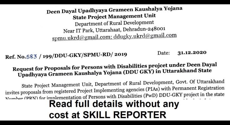 Dehradun: State Project Management Unit, Department of Rural Development, Govt. of Uttarakhand through its RFP Ref. No. 583/199/DDU-GKY/SPMU-RD/2019 Dated 31-12-2021 invites proposals from registered Project Implementation Agencies (PIAs) with Permanent Registration Number (PRN) for implementation of Persons with Disabilities (PwD) DDU-GKY project in the state of Uttarakhand. Interested PIAs may submit their proposals online at www.erp.ddugky.info/ as per prescribed format and process by MoRD along with non-refundable application fee of Rs 25,000 per application drawn in favour of Deen Dayal Upadhyaya Grameen Kaushalya Yojana (DDU-GKY), State Project Management Unit, A/C 00880100017168, Bank of Baroda – Dehradun main branch IFSC Code BARB0DEHRAD (Fifth character is zero in IFSC Code) Dehradun-248001. Qualitative fee will be applicable separately to the qualified PIA. This is in pursuant of Notification 20/2017 dated 3rd April 2017 regarding the appraisal process for new projects.