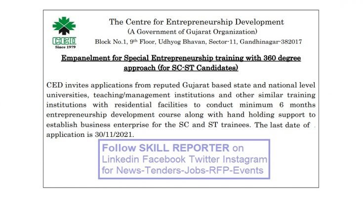 Center for Entrepreneurship Development (CED) invites applications from reputed Gujarat-based state and national level universities, teaching/ management institutions and other similar training institutions with residential facilities to conduct minimum 6 months entrepreneurship development course along with handholding support to establish business enterprise for the SC and ST trainees. The last date of application is 30/11/2021.