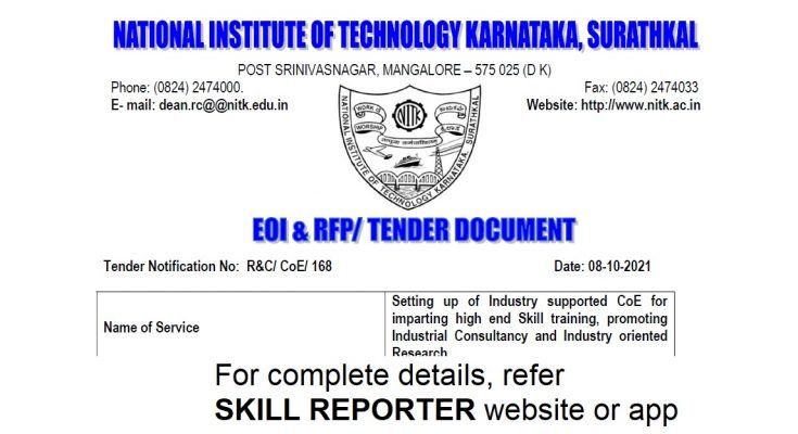 The National Institute of Technology Karnataka, Surathkal (in short NITK, Surathkal) is an Institute Of National Importance Under Ministry of Education, Govt of India, imparting Technical Education and engaged in Research Activities. It is proposed to procure the service of Setting up of Industry supported CoE for imparting high end Skill training, promoting Industrial Consultancy and Industry oriented Research.