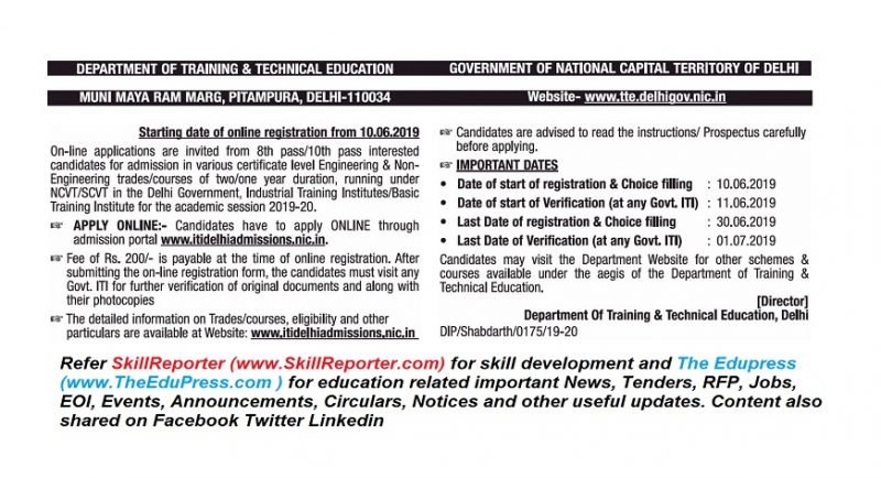 Department of Training & Technical Education, Government of National Capital Territory of Delhi , Muni Maya Ram Marg, Pitampura, Delhi -110034 hereby notifies that