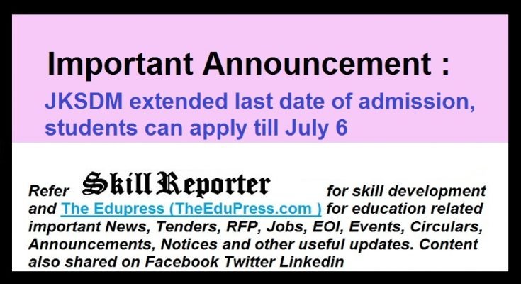 Srinagar : J&K Skill Development Mission (JKSDM) has extended the closing date of admissions of candidates in the second batch of PMKVY (Pradhan Mantri Kaushal Vikas Yojana) scheme till 6 July 2019.