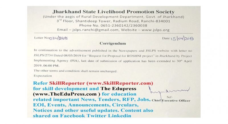Ranchi : In continuation to the advertisement published by Jharkhand State Livelihood Promotion Society (Govt. of Jharkhand) in the Newspapers and JSLPS website with letter no. JSLPS/2734 Dated 08/03/2019 for “Request for Proposal for ROSHNI project” in Jharkhand by Project Implementing Agency (PIA), last date of submission of application has been extended to 30th April 2019, 6:00pm (vide Letter No. 074/JSLPS)