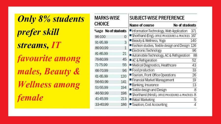 Of the total students opting for skill streams, the highest number — 371 — have applied for the information technology, web application stream. This is the only stream wherein students securing more than 80 per cent are interested. Of the total preferences, 260 were by male students. All 88 applicants, who opted for automobile technology, are male students. Female students have a bent towards shorthand (English), office procedures and practices — 151 out of total 167 students. All 140 preferences for beauty and wellness were from female students. Out of total 126 students preferring fashion studies, textile design and design, 109 are female students.