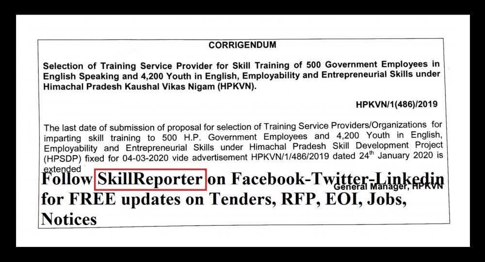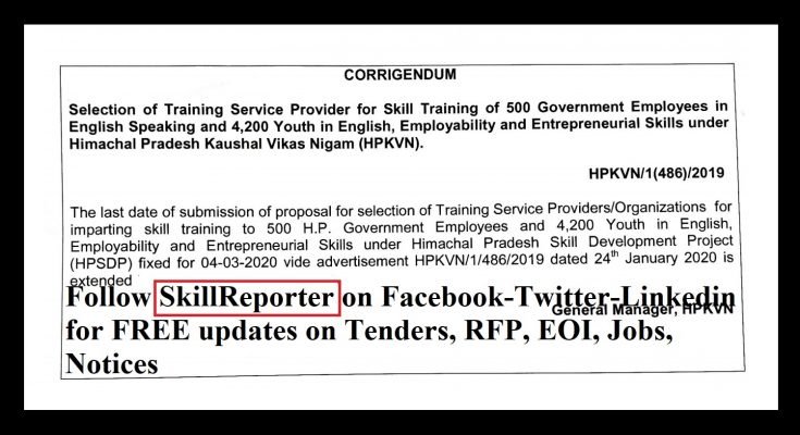 The last date of submission of proposal for Selection of Training Service Provider for Skill Training of 500 Government Employees in English Speaking and 4200 Youth in English, Employability and Entrepreneurial Skills under Himachal Pradesh Skill Development Project (HPSDP) fixed for 04-03-2020 vide advertisement HPKVN/1/486/2019 dated 24th January 2020 is extended to 25th March 2020 till 5pm.