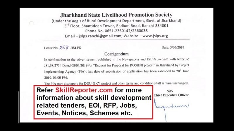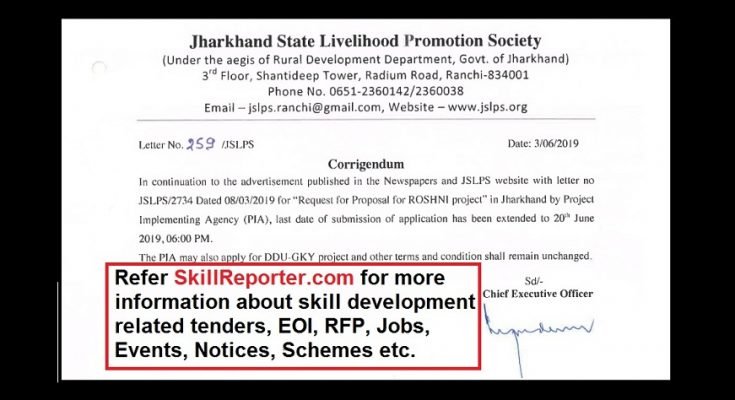 Ranchi : In continuation to the advertisement published by Jharkhand State Livelihood Promotion Society (JSLPS), Rural Development Department, Govt. of Jharkhand in the Newspapers and JSLPS website with letter no. JSLPS/2734 dated 08/03/2019 for “Request for Proposal for ROSHNI project” in Jharkhand by Project Implementing Agency (PIA), JSLPS through its Letter No. 259/JSLPS hereby notifies that the last date of submission of application has been extended to 20th June 2019, 06:00pm.