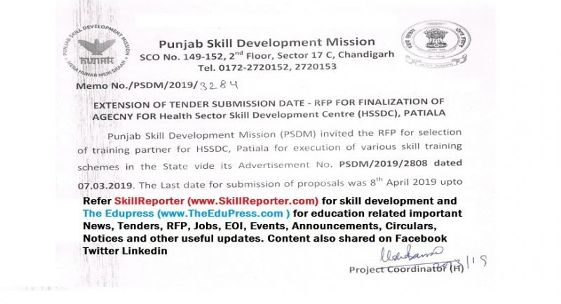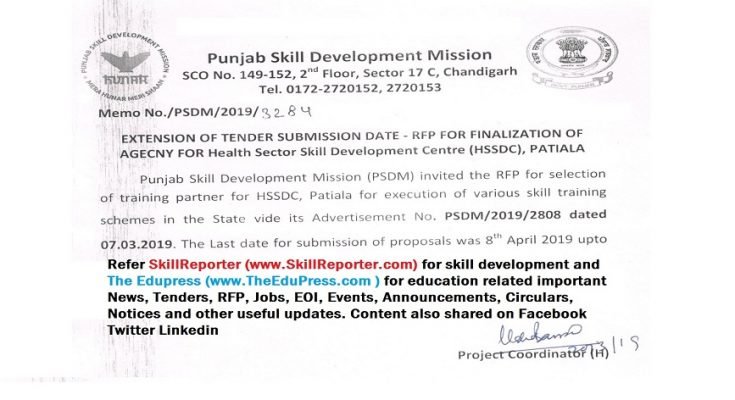 Chandigarh : Punjab Skill Development Mission (PSDM) invited the RFP for selection of training partner for HSSDC, Patiala for execution of various skill training schemes in the state vide its Advertisement No. PSDM/2019/2808 DATED 07.03.2019. The Last Date for Submission of proposals was 8th April up to 3:00 pm. PSDM through its Memo No./PSDM/2019/3284 extend the date and time to 14th May 2019 up to 3:00 pm and opening of bids to certain valid DDs will take place on 14th May 2019 at 3:30 PM.