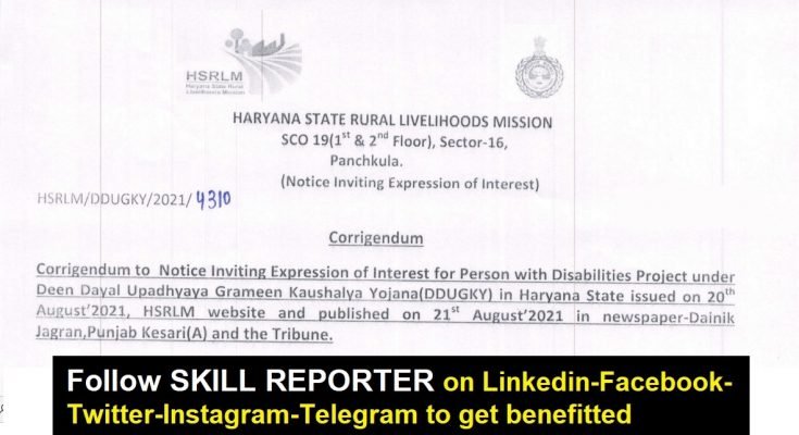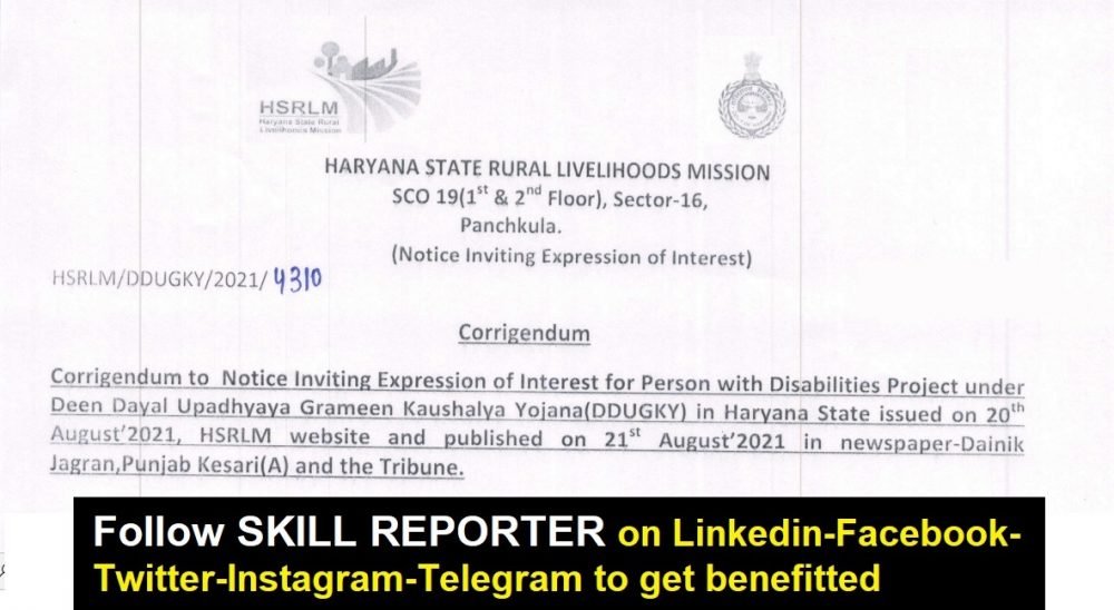 Corrigendum (Ref No. HSRLM/DDUGKY/2021/4310) to Notice inviting Expression of Interest for Person with Disabilities Project under Deen Dayal Upadhyaya Grameen Kaushalya Yojana(DDUGKY) in Haryana State issued on 20th August 2021, HSRLM website and published on 21st August 2021 in newspaper-Dainik Jagran Punjab Kesari(A) and the Tribune.