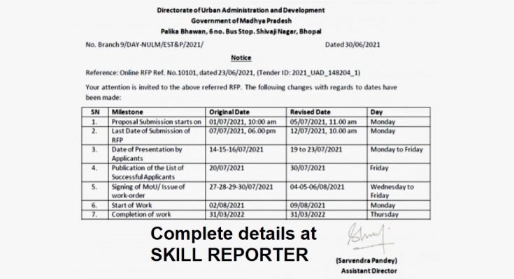 Your attention is invited to the Request for Proposal i.e. Online RFP Ref. No.10101, dated 23/06/2021, (Tender ID: 2021_UAD_148204_1). The following changes with regards to dates have been made vide Notice No. Branch 9/DAY-NULM/EST&P/2021/ Dated 30/06/2021: