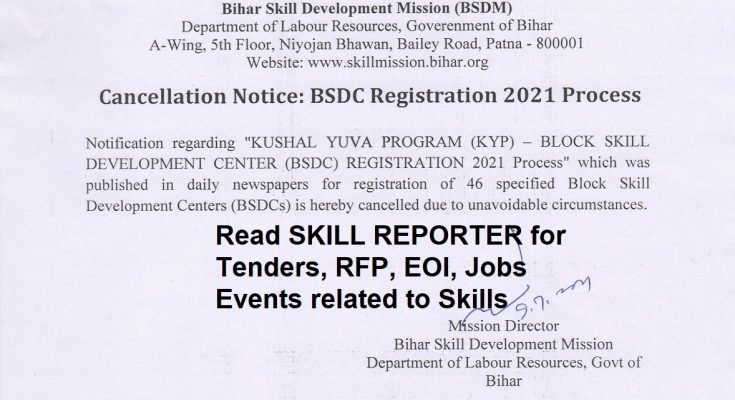 Bihar Skill Development Mission (BSDM), Department of Labour Resources, Goverenment of Bihar A-Wing, 5th Floor, Niyojan Bhawan, Bailey Road, Patna – 800001 intends to cancel the registration process. The official notification can be read as under: