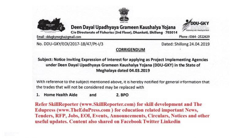 Shilong : With reference “Notice inviting Expression of Interest for applying as Project Implementing Agencies under Deen Dayal Upadhyaya Grameen Kaushalya Yojana (DDU-GKY) in the State of Meghalaya”, State Program Director, DDU-GKY through its notification No. DDU-GKY/EOI/2017-18/47/Pt-I/3 dated 24.04.2019 hereby notifies for general information that the trades that will not be considered may be replaced with