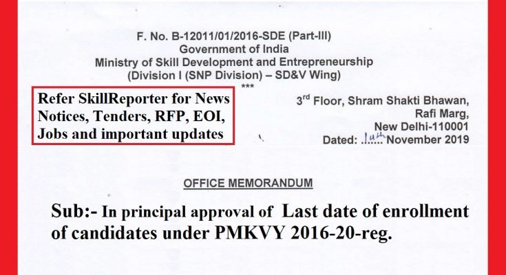 In continuation of the circular of Ministry of Skill Development and Entrepreneurship, Government of India Circular Number B-12011/01/2016-SDE dated 27th May 2019 wherein it was mentioned that States/UTs shall consider 31.12.2019 as the last date of creation of batches under the Centrally Sponsored State Managed (CSSM) component of Pradhan Mantri Kaushal Vikas Yojana (PMKVY) 2016-20 in SDMS and the portal for enrollment of candidates will be closed on 31.12.2019. In this regard, Competent authority (MSDE), after duly examining the request received from States/UTs has approved in-principal that as the scheme is till March 2020 i.e. 31st March 2020; accordiningly enrollment may be done till 31.03.2020 under Centrally Sponsored Centrally Managed (CSCM) and CSSM component of PMKVY 2016-20 by the National Skill Development Corporation (NSDC) and States/UTs and enrollment shall be closed on 31.03.2020 with no further extension. To read the previous notification, Click Here
